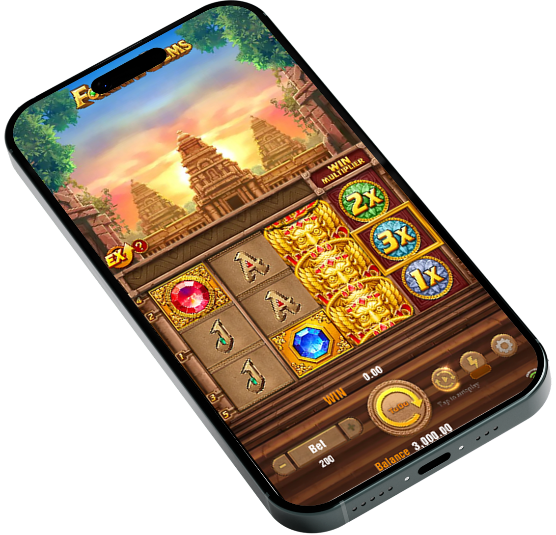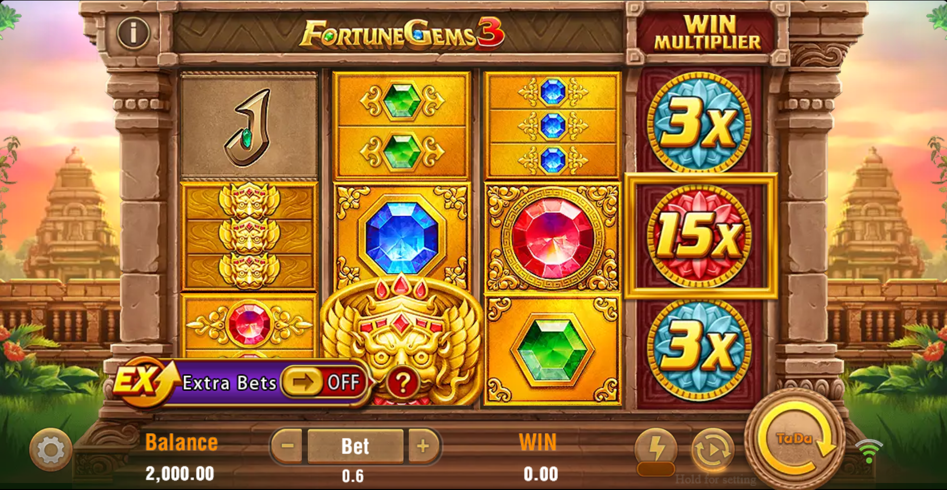 Fortune Gem places you in an ancient temple setting: stone architecture, glowing gems, subtle ambient audio — the kind of atmosphere that appeals to younger players who want a polished look without over-complexity. According to a review from 2024, the game is set in a "Garuda temple" environment in the jungle.
